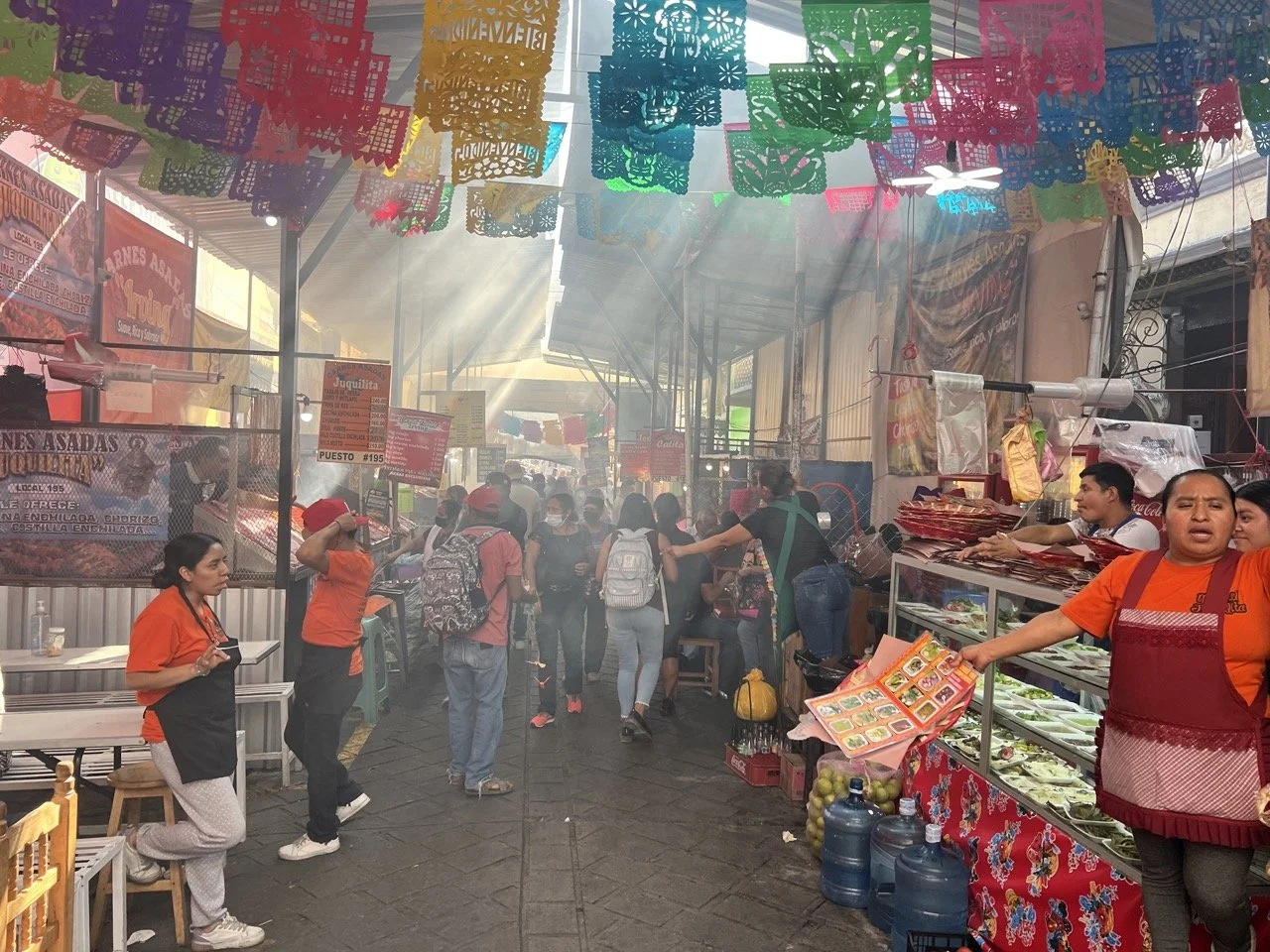 A super interesting experience that was unique to anything that I have ever seen in the U.S. was eating at the Pasillo de Humo. The Pasillo de Humo used to be a small alleyway in an indoor market, but it has been temporarily moved outdoors for renovation. It now takes up an entire street. As soon as you walk in you are immediately confronted by all of the different stalls trying to sell you their fresh meats. It is hard to see well because of all of the smoke from meat being cooked, and then add on top of the smoke people trying to sell things to you right up in your face. Once we had picked a stall to order meat from, we pointed out some raw meat that they had on display, and they just grabbed it and threw it on a grill. We ordered some tortillas and sat down at a random table. It was so loud, full of people, and just chaotic there. It felt good to be sitting instead of being mixed up in the hustle and bustle. When our meat arrived, we immediately dug right in. It was delicious! All of the different types of meat we ordered, including steak, sausage, and pork, were all cooked perfectly, and they were delicious with the freshly made tortillas. I will always think of sitting in that crowded street, surrounded by so many different noises, and being engulfed in delicious-smelling smoke whenever I sit down at a quiet restaurant.